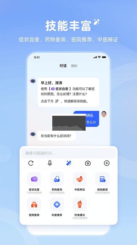 包含“健康自查”“药物查询”“中医辩证”“报告解读”“医院推荐”“科室推荐”“饮食建议”七大功能,满足用户的使用需求,为用户提供精细的健康咨询与就医建议。