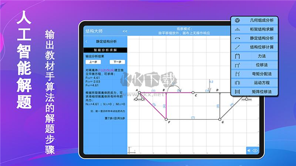 独创的智能模块,利用人工智能学算法支持输出结构力学教材上所有方法(位移法、力法…)的解题步骤。