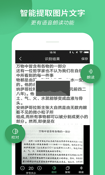支持手机任何界面文字放大、文字识别、朗读、 复制、搜索