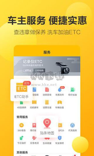 为车主提供包含洗车、ETC办理、违章查询代办、优惠加油、扫码挪车、律师服务、道路救援、新旧车买卖、车险购买等多种实用服务,支持微信及支付宝等线上支付方式。