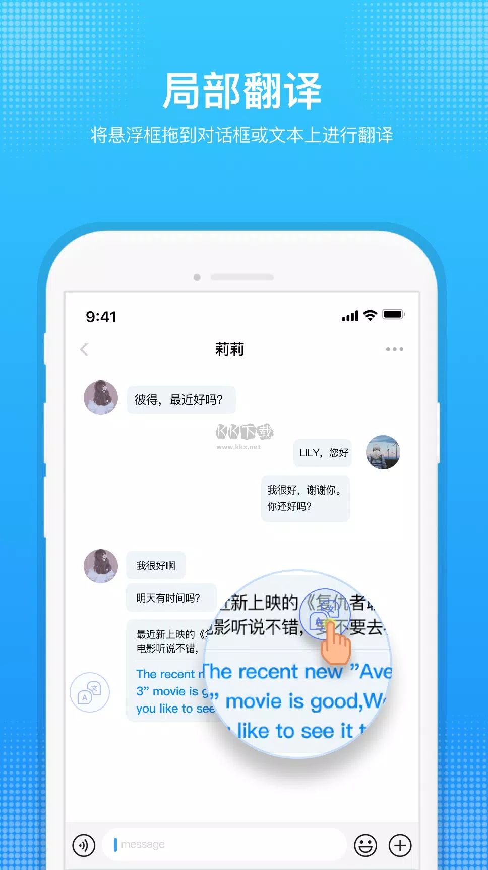 跨应用翻译: 在任何应用中使用浮动球进行即时翻译,支持帖子/博文、聊天对话、文本等翻译,无需切换翻译软件。