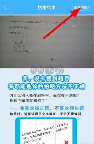 4、上传题目后,将会出现结果,小编由于没有拍好,所以没有搜到题目,可以点击右上角重新拍照的。
