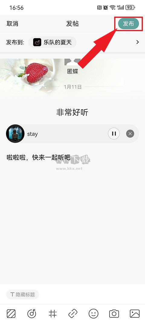 之后用户就可以编辑自己要发布的内容啦,可以使用下方的工具进行辅助,比如添加图片、表情、音乐等等。