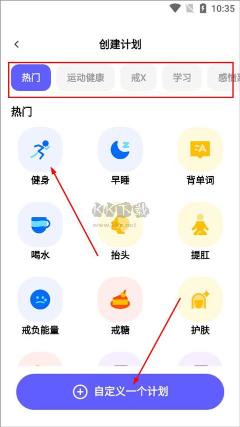 3、创建计划可以按照热门(健身、早睡、背单词、喝水等)、运动健康、戒xx、学习、感情建设等分类创建,也可点击下方自定义计划;