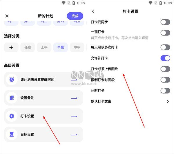 5、设置高级设置,计划提醒时间、设置备注、打卡设置、目标设置,打卡设置可同步或者一键打卡,还可以设置多次打卡以及上传打卡图片等,设置好之后即可在计划页面查看;