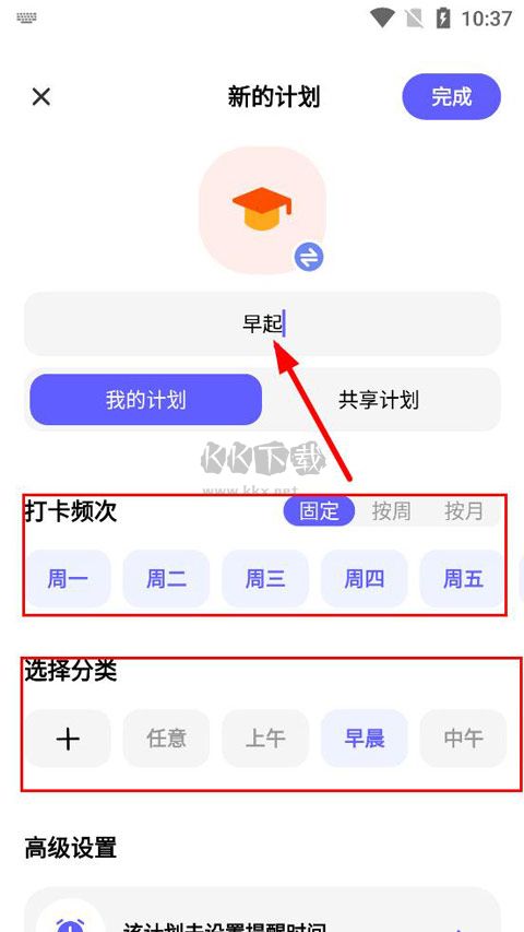 4、输入计划标题,设置打卡频次(固定、按周、按月),选择打卡时间分类(任意时间、上午、早晨、中午);