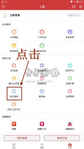 首先我们打开软件,点击软件下方的【工具】功能分区,来到工具的界面,在这里我们可以看到一个吉日查询,点击这个吉日查询。