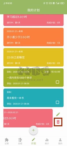 首先来到计划的页面,我们长按一个要删除的计划,然后向左拖动,就会出来两个选项,一个是编辑,一个是删除,我们点击那个垃圾桶形状的选项就能删除计划了。