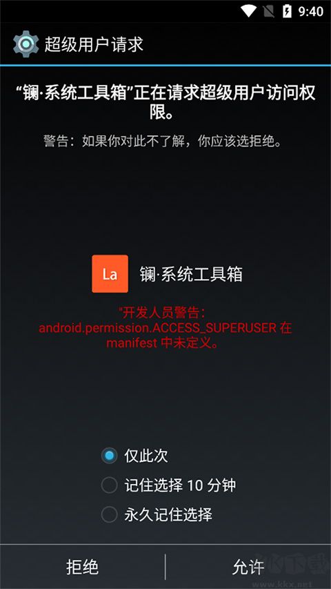 首先用户打开这个软件后,就会出现如下页面提示,该页面提示是让用户允许软件获得用户手机超级用户的使用权限,已更好地让软件顺利地工作,,一般默认选择【仅此次】选项后进行允许操作