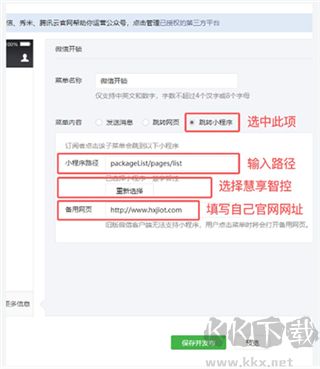 3、根据页面填写信息:菜单内容选择跳转小程序,填写小程序路径: packageList/ pages/index,小程序搜索选择:慧享智控,填写备用网页:酒店/公寓自己的官网;