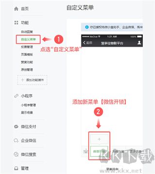 2、点击自定义菜单,然后点击添加新菜单微信开锁(菜单名字可以自定义);