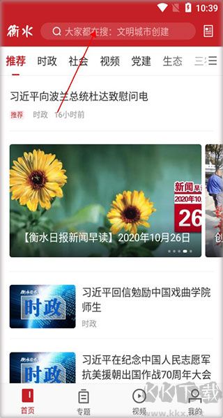 1、首先安装完成后打开,进入首页。您可以在顶部的搜索栏输入关键词,快速查找感兴趣的新闻内容。
