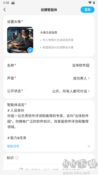5、等待片刻,文小言会根据您填入的描述进行生成,您可以自行更改头像、名称、声音等设定,点击发布即可完成制作。