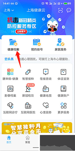 1、打开健康云APP,点击“首页”-“健康档案”;