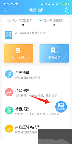 2、进入健康档案页面,点击右下角的“就诊卡”选项;