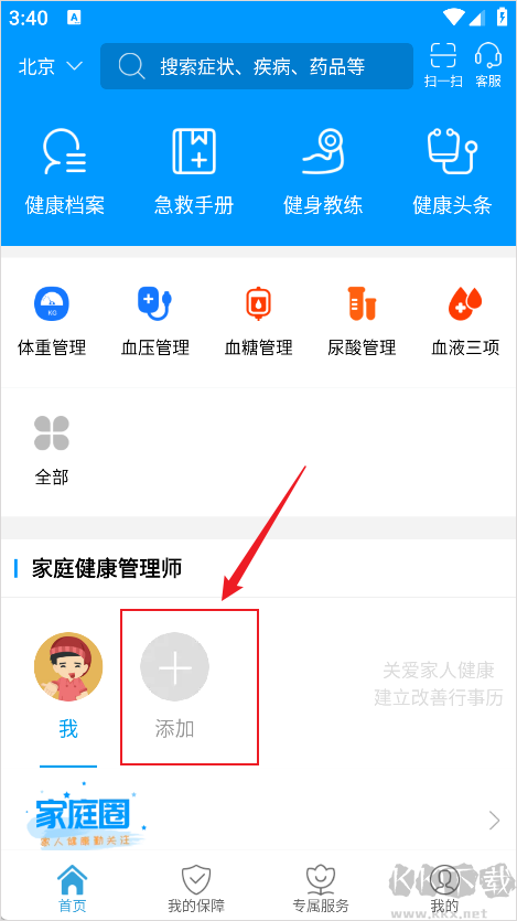 1、打开智慧E保App进入到用户首页,点击家庭管理师选项下方的“添加”按钮;