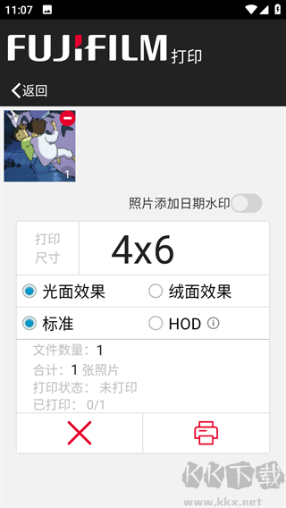 6、默认输出 4×6 英寸照片,可选光面或绒面材质,色彩模式包括标准与 HOD(鲜艳不失真),体现富士专业色彩处理能力。