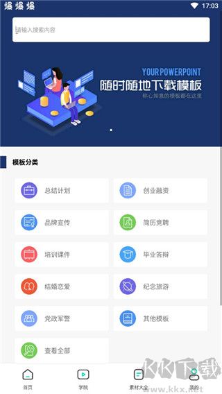 PPT制作app是一款高效便捷的手机PPT办公学习工具。提供PPT素材搜寻、下载、制作等功能,帮助随时随地找到需要的办公资源文件,简化工作、提升效率。里面的PPT模板涵盖工作总结、求职应聘、商业计划书、企业宣传、结婚恋爱、毕业答辩等众多使用场景;点击模板内文字能直接修改,图片也可以替换,操作简单便捷。需要的朋友快来下载试试吧!