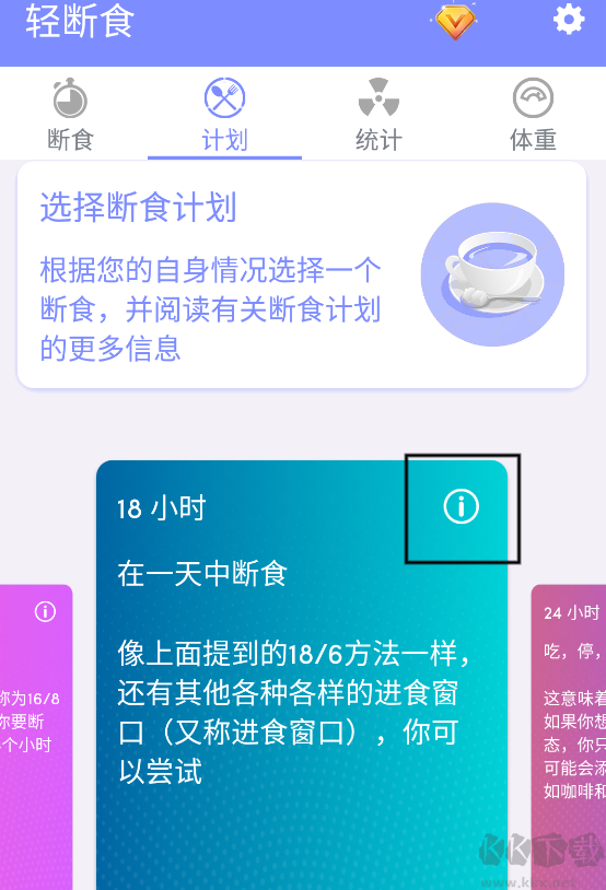 1、进入软件我们首先在计划栏选择一个适合自己身体情况的断食计划,可以选择12小时、16小时等等其他科学计划,也可以根据自身情况定做一个计划。点击各计划右上角的感叹标,可以看到该断食计划的科学说法!