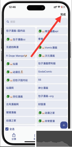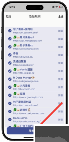4、在解析出的漫画源中勾选所需内容,点击"覆盖/添加";