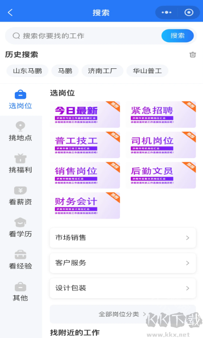 2、“找工作”板块提供多种职位分类,可根据需求选择;