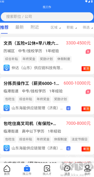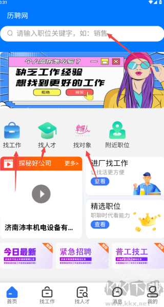 1、进入首页后可搜索岗位,或选择“找工作”与“找人才”板块;