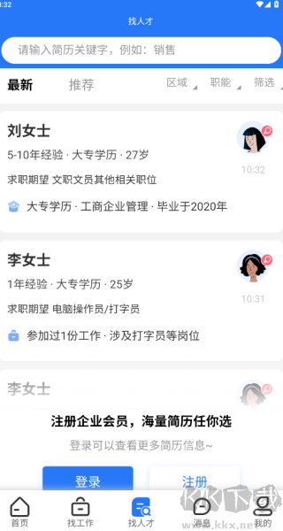 3、“找人才”面向企业用户,用于浏览简历、筛选合适人选;