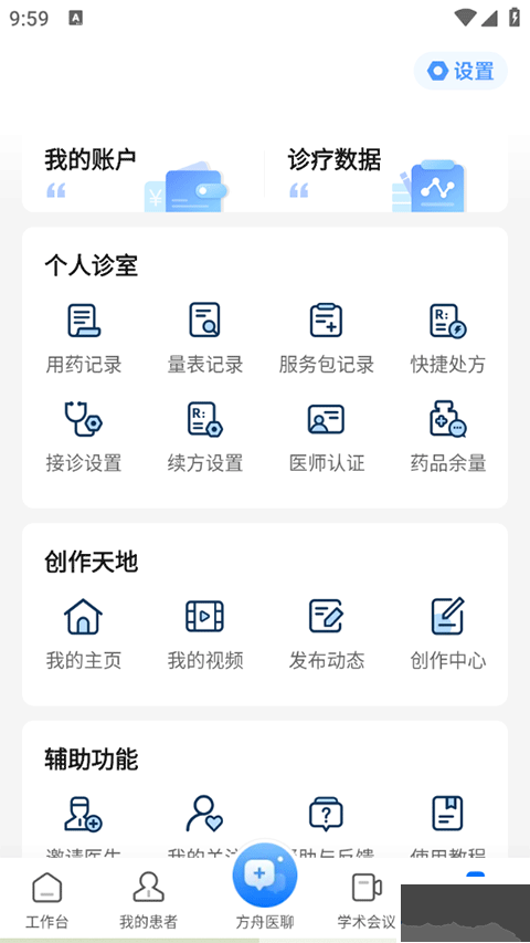 3、最后在个人中心页面提供了个人诊室、创作天地以及辅助功能等众多功能服务内容。