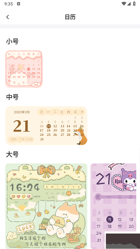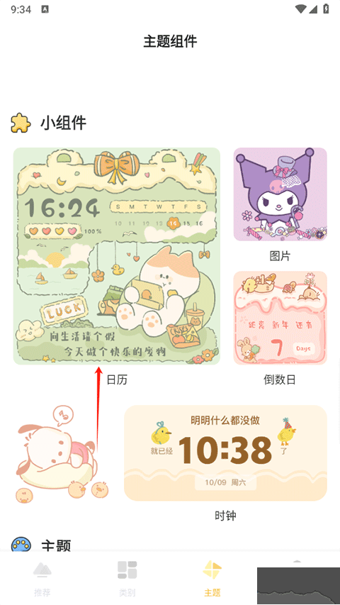 1、在主题界面内上方挑选你想添加的小组件,例如日历;