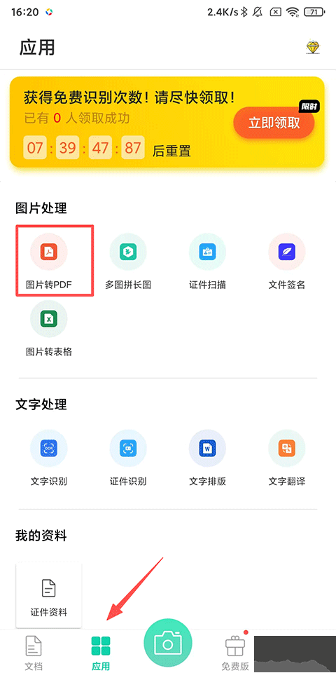 1、打开全能扫描王免费版APP,点击【应用】-【图片转PDF】;