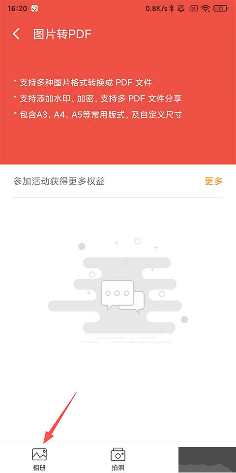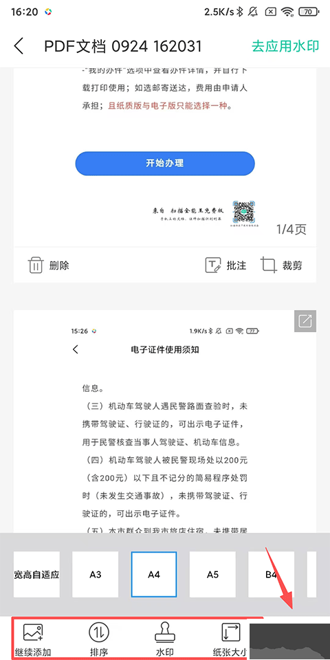 3、导入图片后自动生成PDF文档,下方可继续编辑,如:继续添加、排序、水印、纸张大小等;