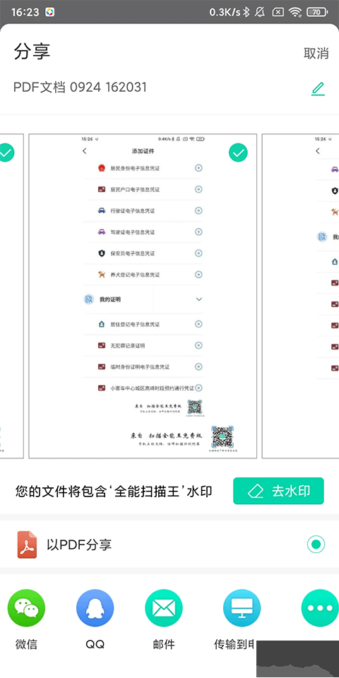 4、最后点击【完成】就可以分享PDF文档到微信、QQ、邮件、传输到电脑以及保存本地。