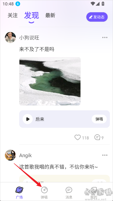 4、在广场中不仅能发现热门音乐内容,还能将自己的弹唱视频发布分享,让更多人听见你的声音;