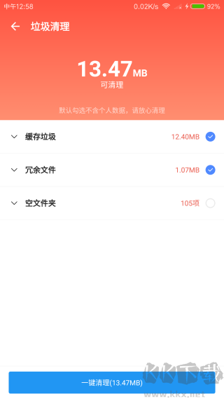 2、点击中间的"查看垃圾详情"就能看到扫描出来的垃圾文件啦,点击"一键清理"能快速释放手机内存与空间