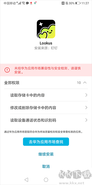 1、该应用未在华为应用市场上架,使用者可在本站免费获取 Lookus 的安装包,无需对华为手机的安装程序做特别调整,直接跳过华为应用市场的检测点击安装即可。