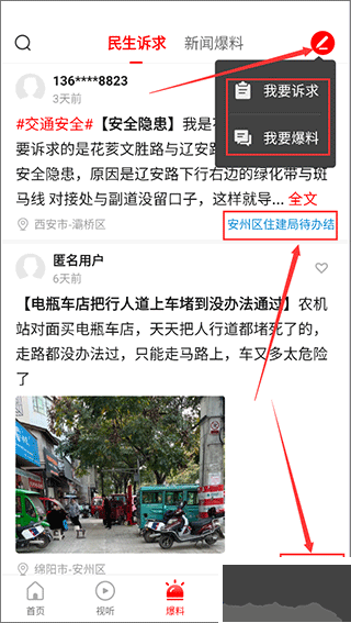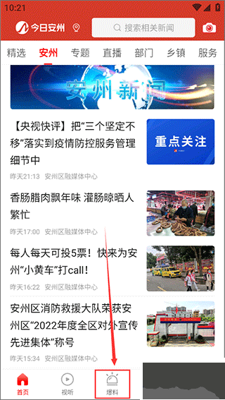 1、下载后打开今日安州,在首页下方的模块栏中选择“爆料”进入