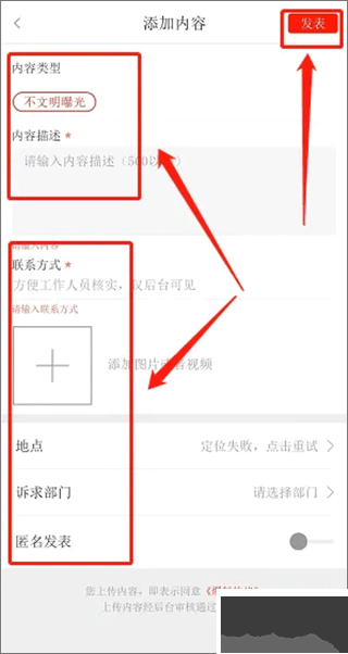 3、最后进入添加内容界面,选择内容类型、输入内容描述、联系方式、上传图片、诉求部门、是否匿名发表,点击【发表】即可