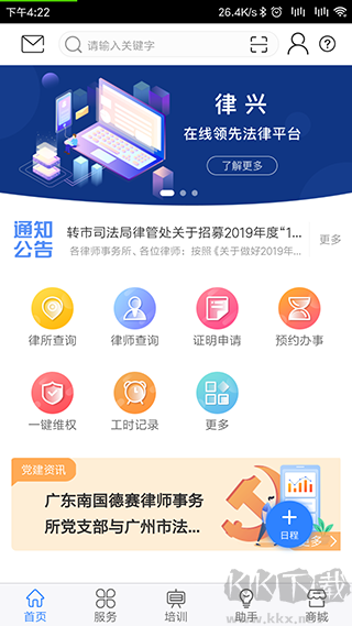 律兴app是一款为广州市律师协会会员打造的服务软件,支持直接使用广州市律师协会网的账号密码登录,不需要额外注册。提供了丰富的常用功能,涵盖活动报名、在线视频培训、一键维权、预约办事、年度考核、费用计算工具,以及第三方商城提供的相关服务。软件还能帮助律师详细记录工作时间、进行工时统计等,方便日常工作管理。需要的朋友快来下载试试吧!