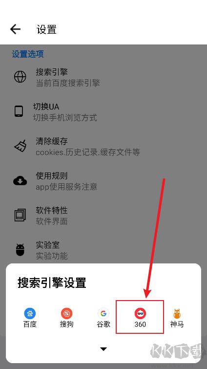 在搜索框输入关键词后,点击输入框下方的搜索引擎图标即可切换,支持谷歌、百度、360、神马、夸克等多种无广告搜索渠道。