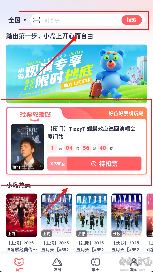 1、进入纷玩岛App后在首页位置找到抢票区或者通过上方搜索框输入需要抢票的演唱会