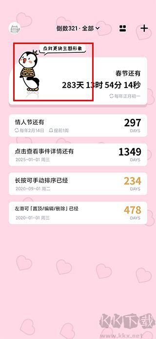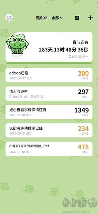 倒数321app是一款帮你记录生活中重要日子的倒计时软件。它的功能强大,包含倒数日、正数日、记录纪念日、生日、传统节日等功能。还可以根据自己的喜好,从蜜蜂、萌鸭、小熊、孤寡孤、大鹅、兔叽叽、狐狸、麋鹿等多种可爱卡通动物形象里,挑选喜欢的设为软件背景,整体画风特别Q萌可爱。还支持把倒计时和纪念日随意设置到手机桌面、通知栏、锁屏等地方,就能更好地提醒你,用起来非常实用。需要的朋友快来下载试试吧!