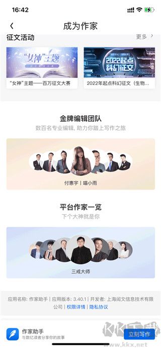同样在底部找到“立即写作”,在这里需要用户下载并安装“作者助手”。