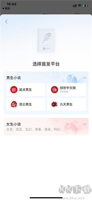 3、完成账号登录后,便可定义书名。之后选择首发平台,男生小说可选择的首发平台包括起点男生、创世中文网、昆仑男生和九天男生;女生小说可选择的首发平台起点女生、云起书院、红袖添香、潇湘书院、昆仑女生及九天女生等。