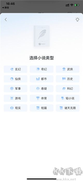 4、然后挑选小说类型,如玄幻、奇幻、武侠、仙侠、都市、历史、军事、悬疑、科幻、游戏、体育、轻小说以及现实、短篇和诸天无限等等。