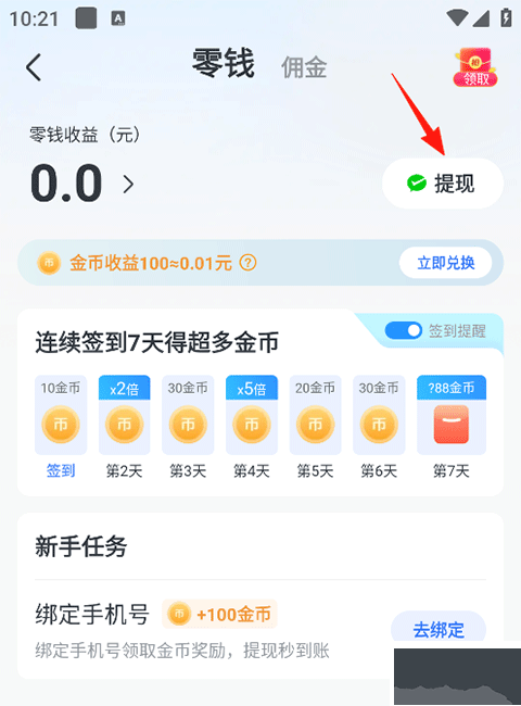 2、金币收益100=0.01元,通过金币兑换零钱来赚取佣金,随后点击提现;