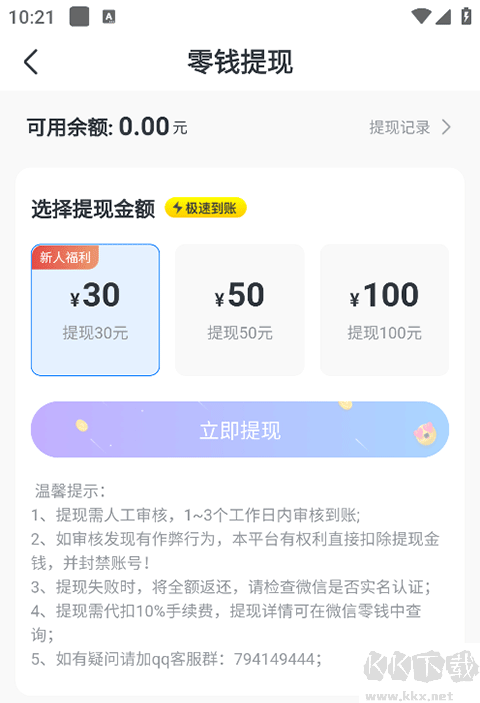 3、支持30、50、100元提现,点击下方立即提现即可提现到微信。