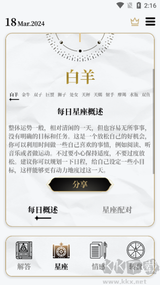 3、每日星座:提供每日星座运势解读,探索星辰背后的生活启示。还可自由组合十二星座进行配对测评,了解彼此的契合程度与互动关系。