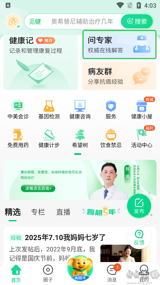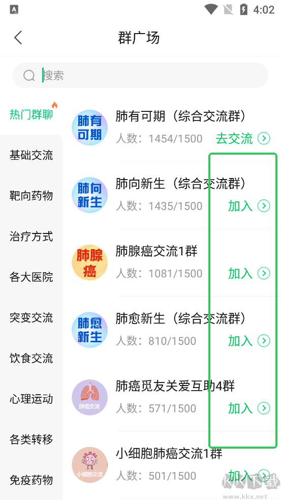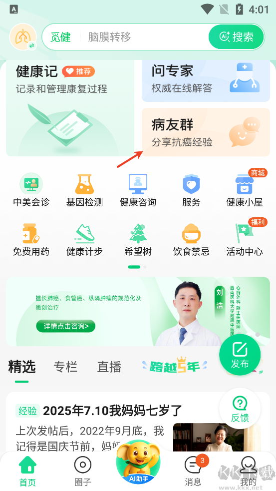 答:在“圈子”页面搜索您所属的病种(如肺癌、乳腺癌等),点击进入后选择“加入”,即可参与话题讨论、查看经验分享。