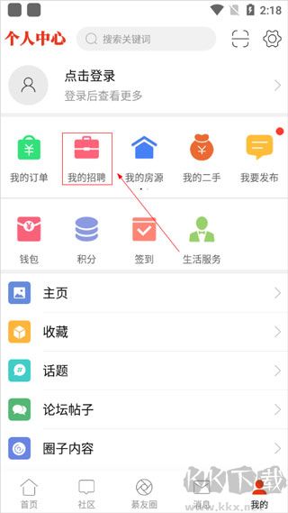 1、进入綦江在线 APP 的个人中心页面,点击 “我的招聘”。