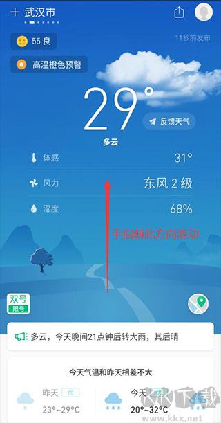 1、打开彩云天气的主界面,手指从下往上滑动,拉到下方的详情内容。
